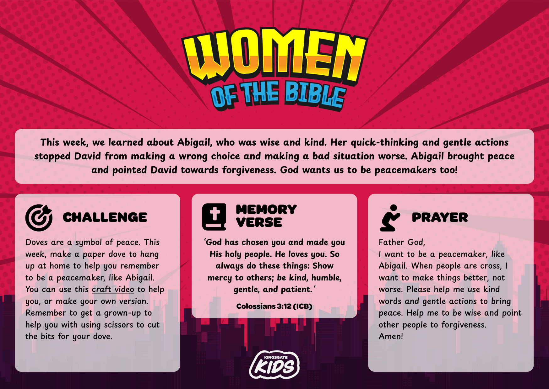Father God, I want to be a peacemaker, like Abigail. When people are cross, I want to make things better, not worse. Please help me use kind words and gentle actions to bring peace. Help me to be wise and point other people to forgiveness. Amen!