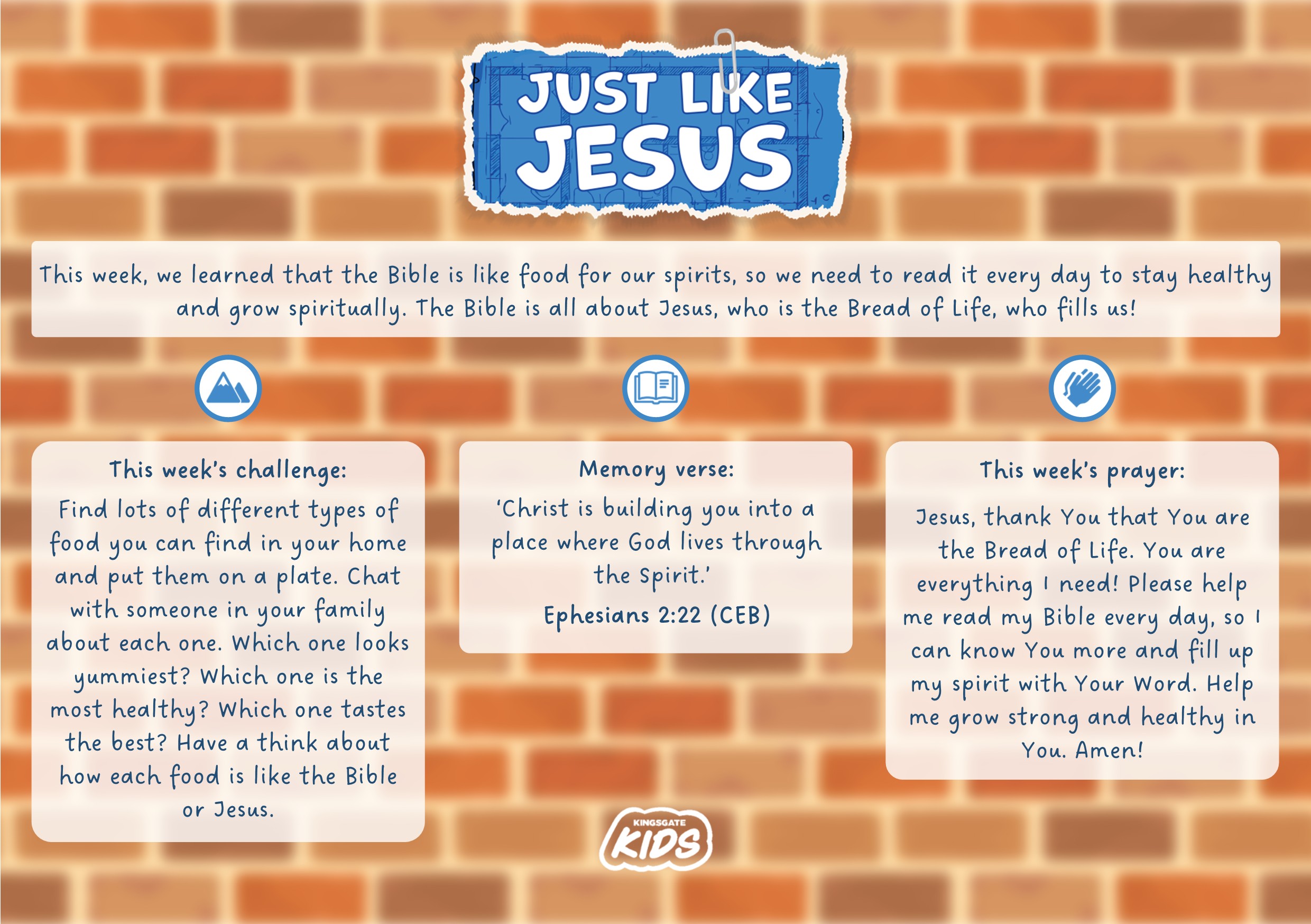 Jesus, thank You that You are the Bread of Life. You are everything I need! Please help me read my Bible every day, so I can know You more and fill up my spirit with Your Word. Help me grow strong and healthy in You. Amen!