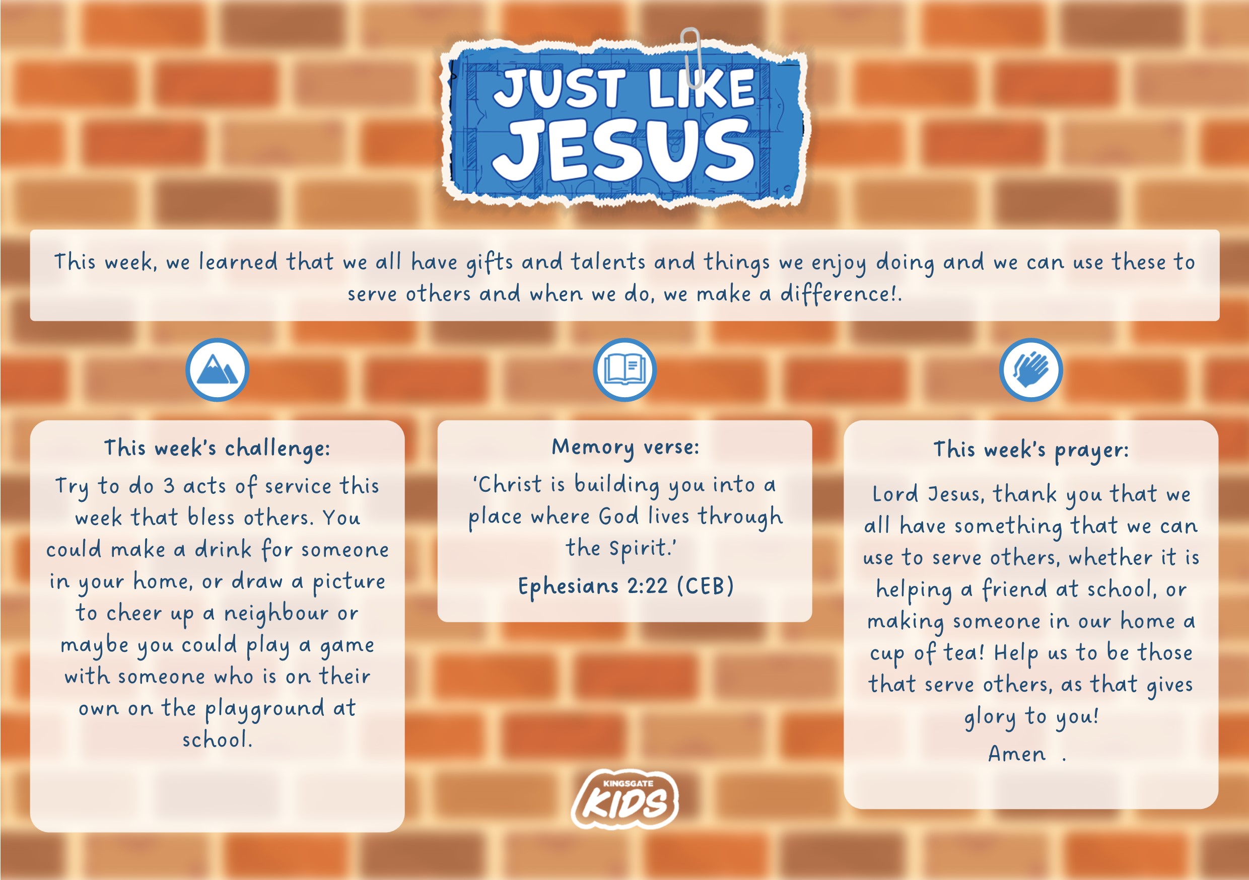 Lord Jesus, thank you that we all have something that we can use to serve others, whether it is helping a friend at school, or making someone in our home a cup of tea! Help us to be those that serve others, as that gives glory to you!