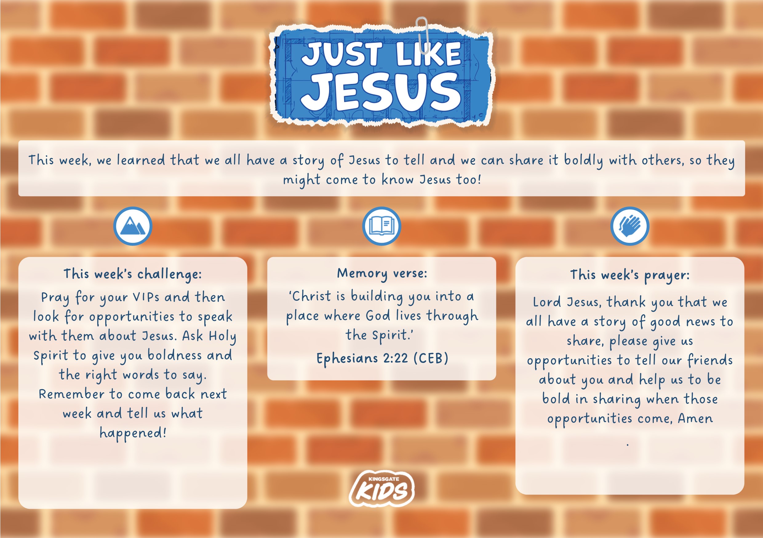 Lord Jesus, thank you that we all have a story of good news to share, please give us opportunities to tell our friends about you and help us to be bold in sharing when those opportunities come, Amen