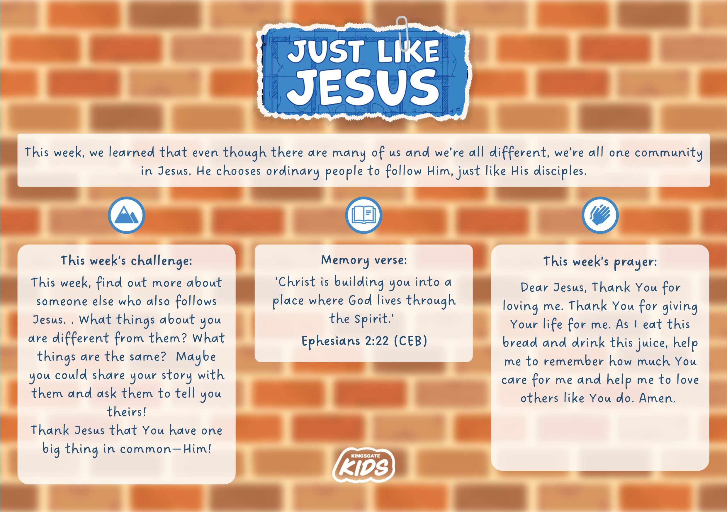 Dear Jesus, Thank You for loving me. Thank You for giving Your life for me. As I eat this bread and drink this juice, help me to remember how much You care for me and help me to love others like You do. Amen.