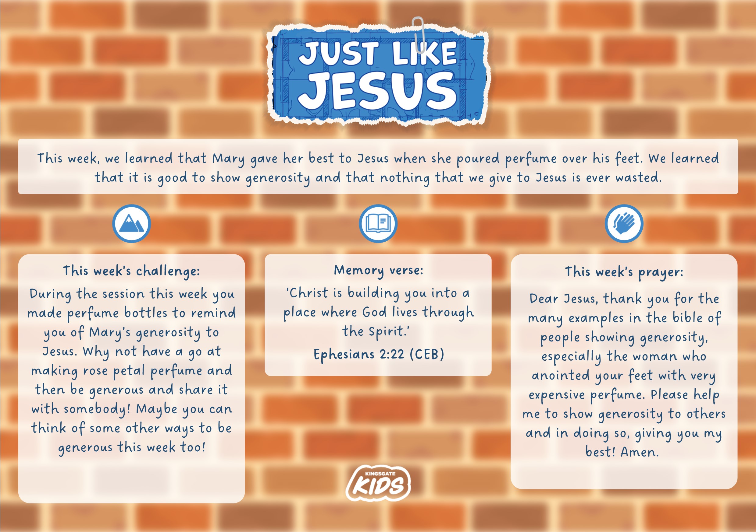 Lord Jesus, thank you for the many examples in the bible of people showing generosity, especially the woman who anointed your feet with very expensive perfume. Please help me to show generosity to others and in doing so, giving you my best!