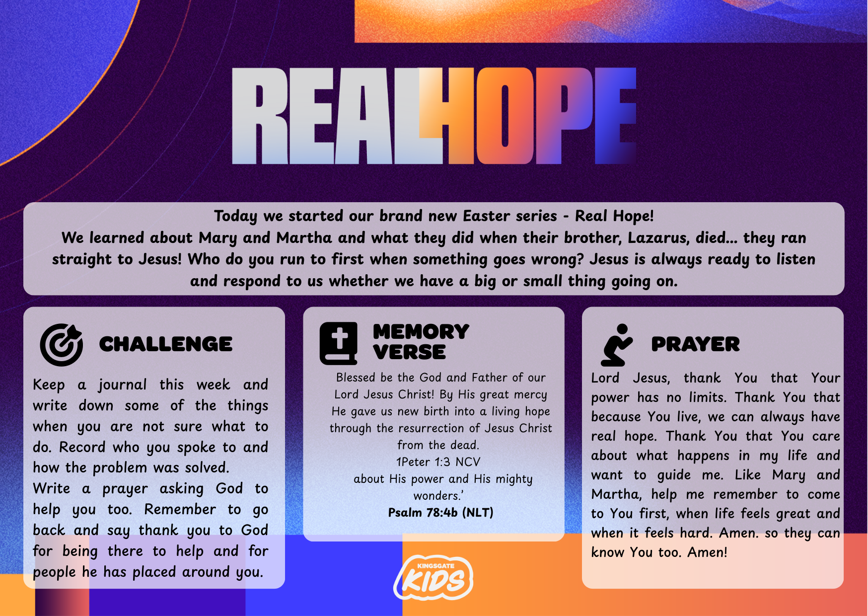 Lord Jesus, thank You that Your power has no limits. Thank You that because You live, we can always have real hope. Thank You that You care about what happens in my life and want to guide me. Like Mary and Martha, help me remember to come to You first, when life feels great and when it feels hard. Amen.